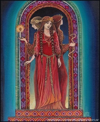 Итак, языческая Бриджит, это то одна богиня то целых три. Имя ее переводят как "Владычица", "Королева", "Высокая". На основе этого перевода, а также широчайшего распространения его по всем уголкам Кельтского мира, иногда делают вывод, что это и не имя вовсе, а то ли титул, то ли слово "богиня" вообще.