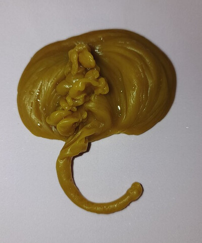 Момент запечатленный на отливке похож, что сущность сорвало с человека магической работой, или процессом отливки и часть энергии, что она "насосалась" возвращается человеку. Этот момент, в большинстве случаев, сопровождается приподнятым энергетическим состоянием, а в редких - временной болью различной интенсивности, типа невралгической, мигрени, "туманом" в голове.